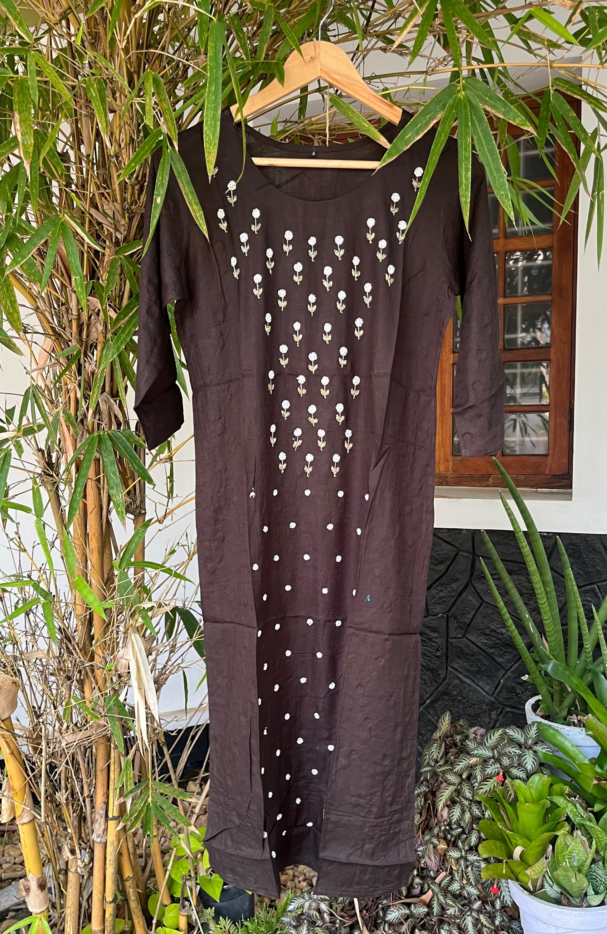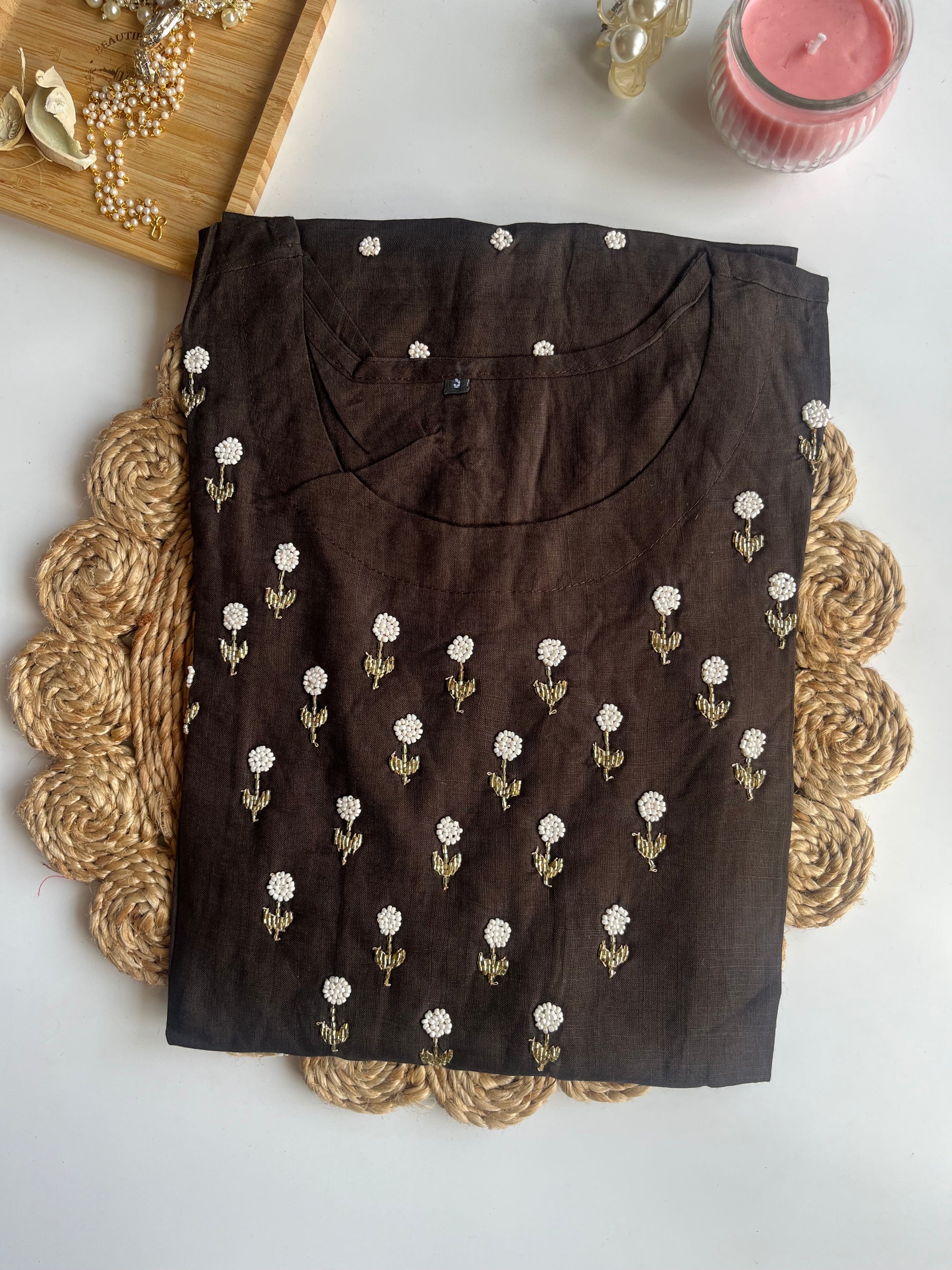 This graceful brown handwork kurta features intricate detailing that highlights the beauty of traditional craftsmanship. With a stylish round neck and a flattering length of 44 to 46 inches, this kurta offers a perfect blend of comfort and elegance. Ideal for festive occasions or a casual day out, it is crafted to provide a premium look and feel.