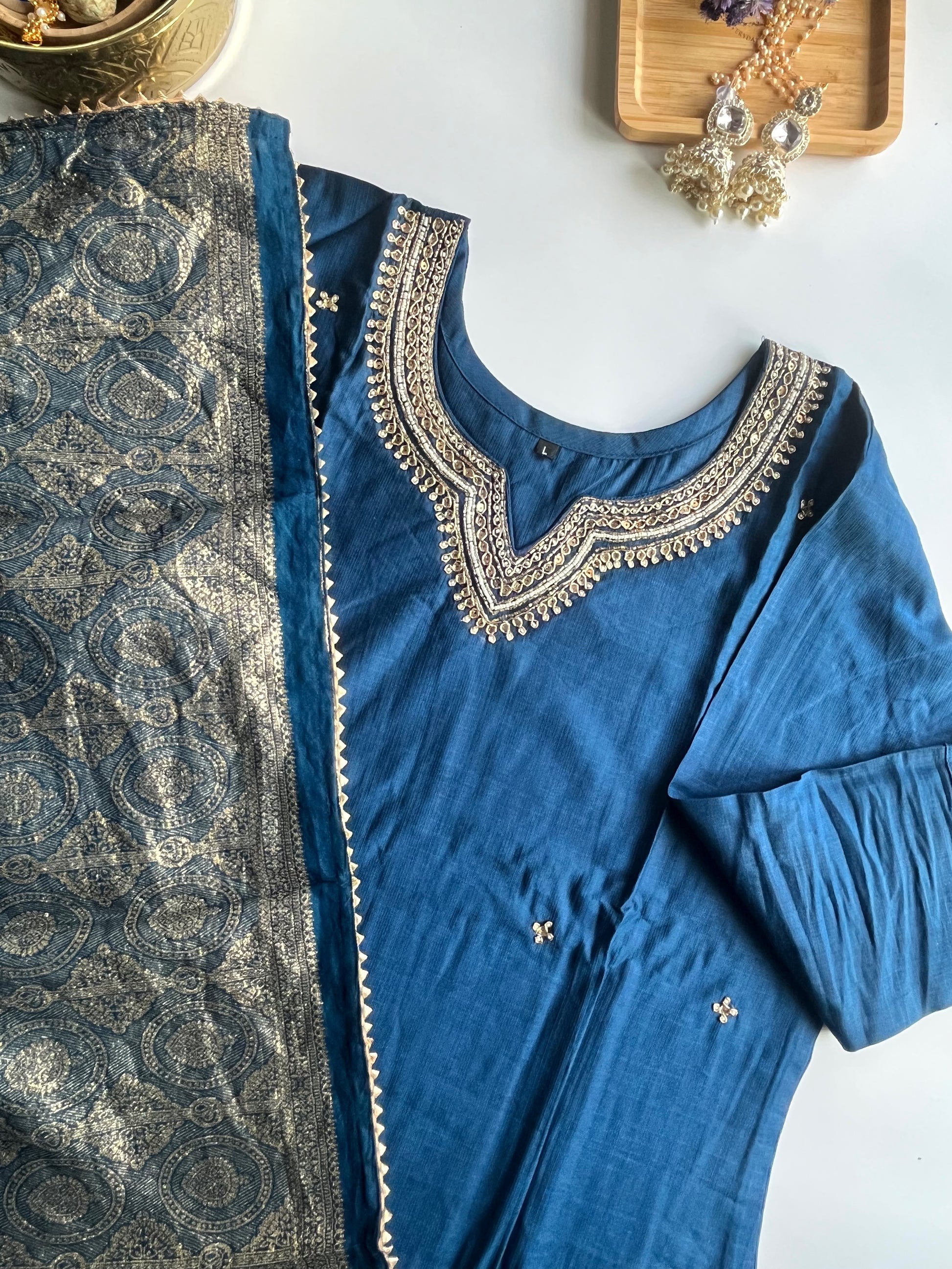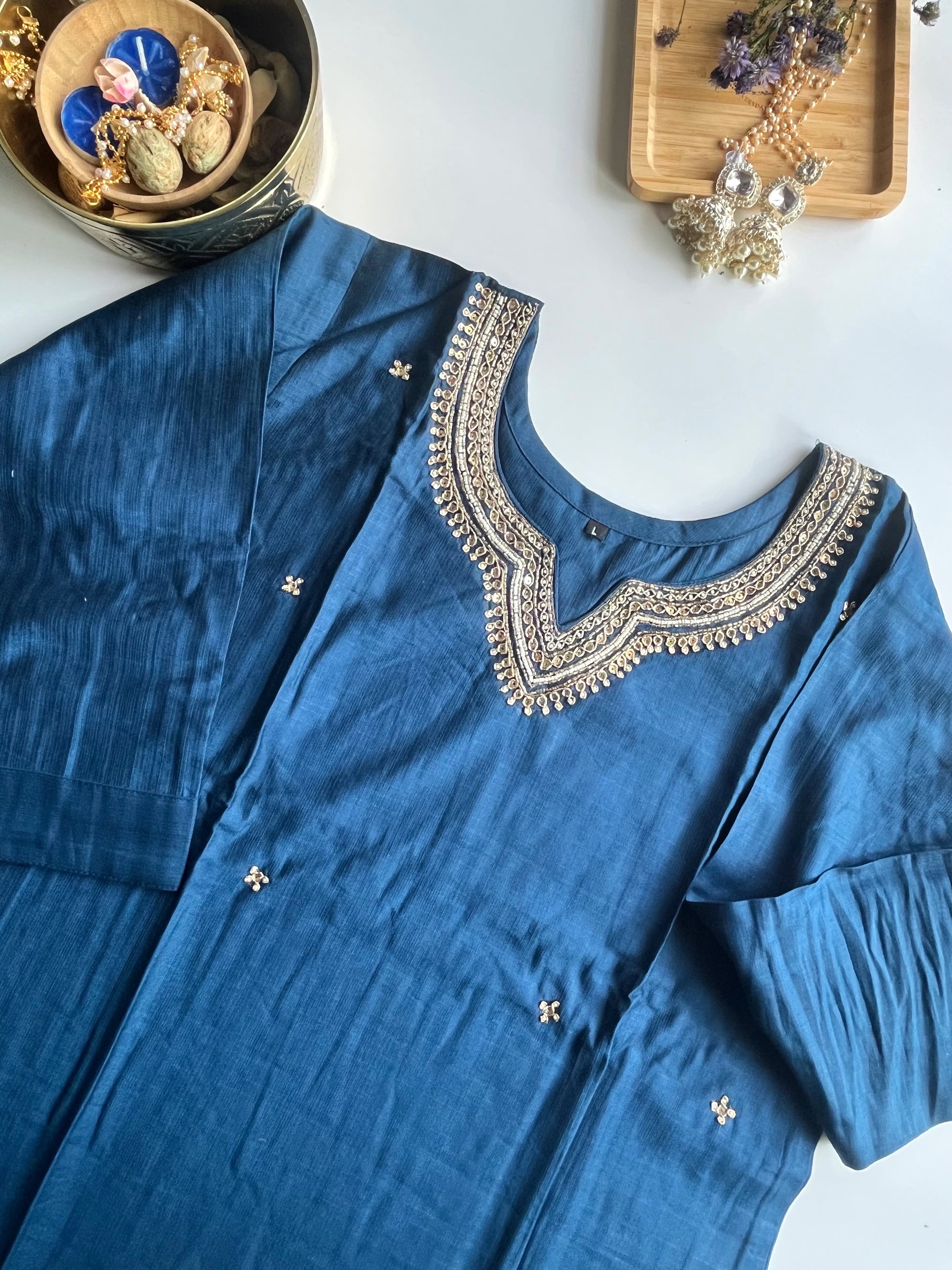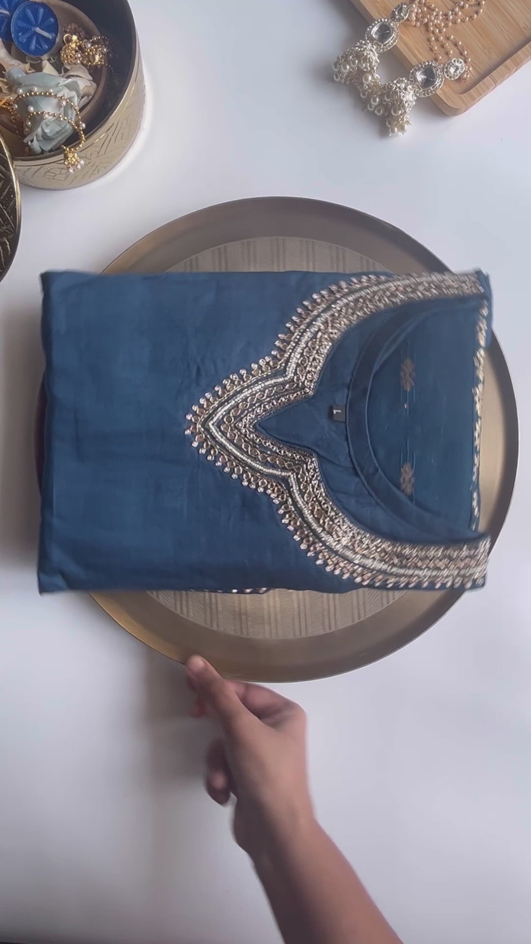 Elevate your ethnic wardrobe with our premium Indira Kurti Set, crafted in luxurious Vatican silk. The elegant indigo blue hue is adorned with intricate handwork on the neckline and delicate motifs on the body, showcasing timeless artistry. Paired with a stunning dupatta and a plain silk bottom, this ensemble is perfect for festive occasions, weddings, or celebrations where you want to stand out.