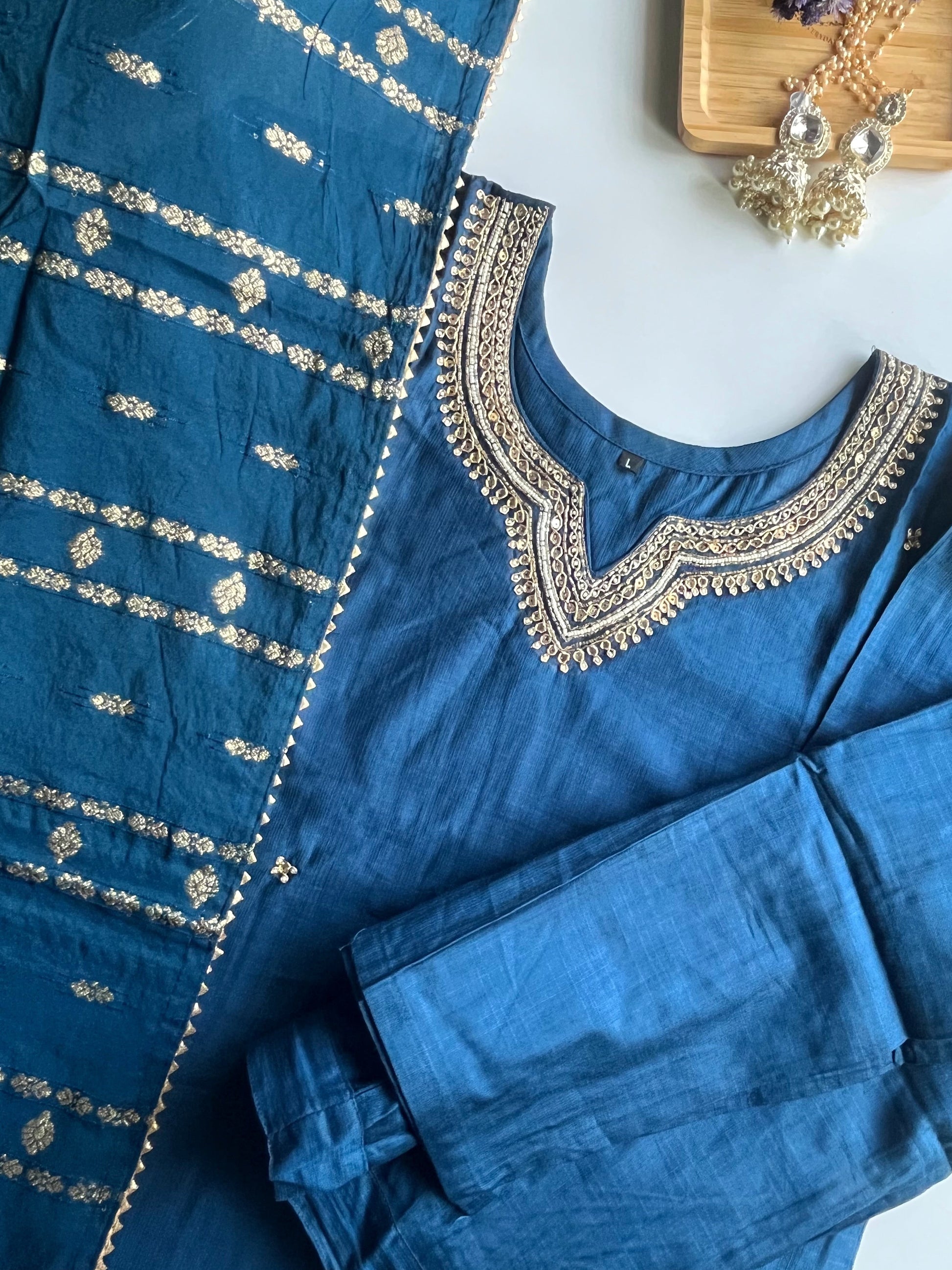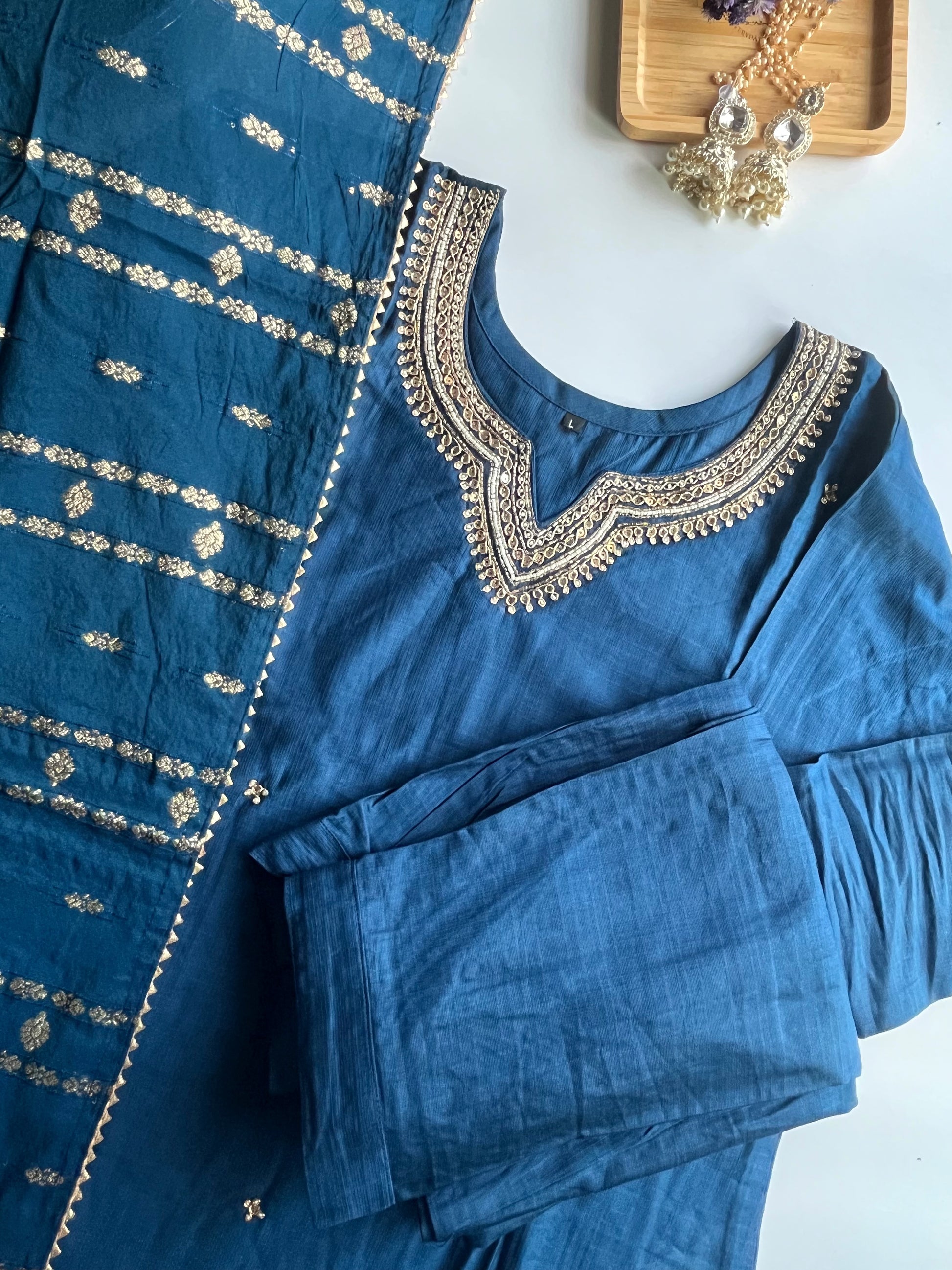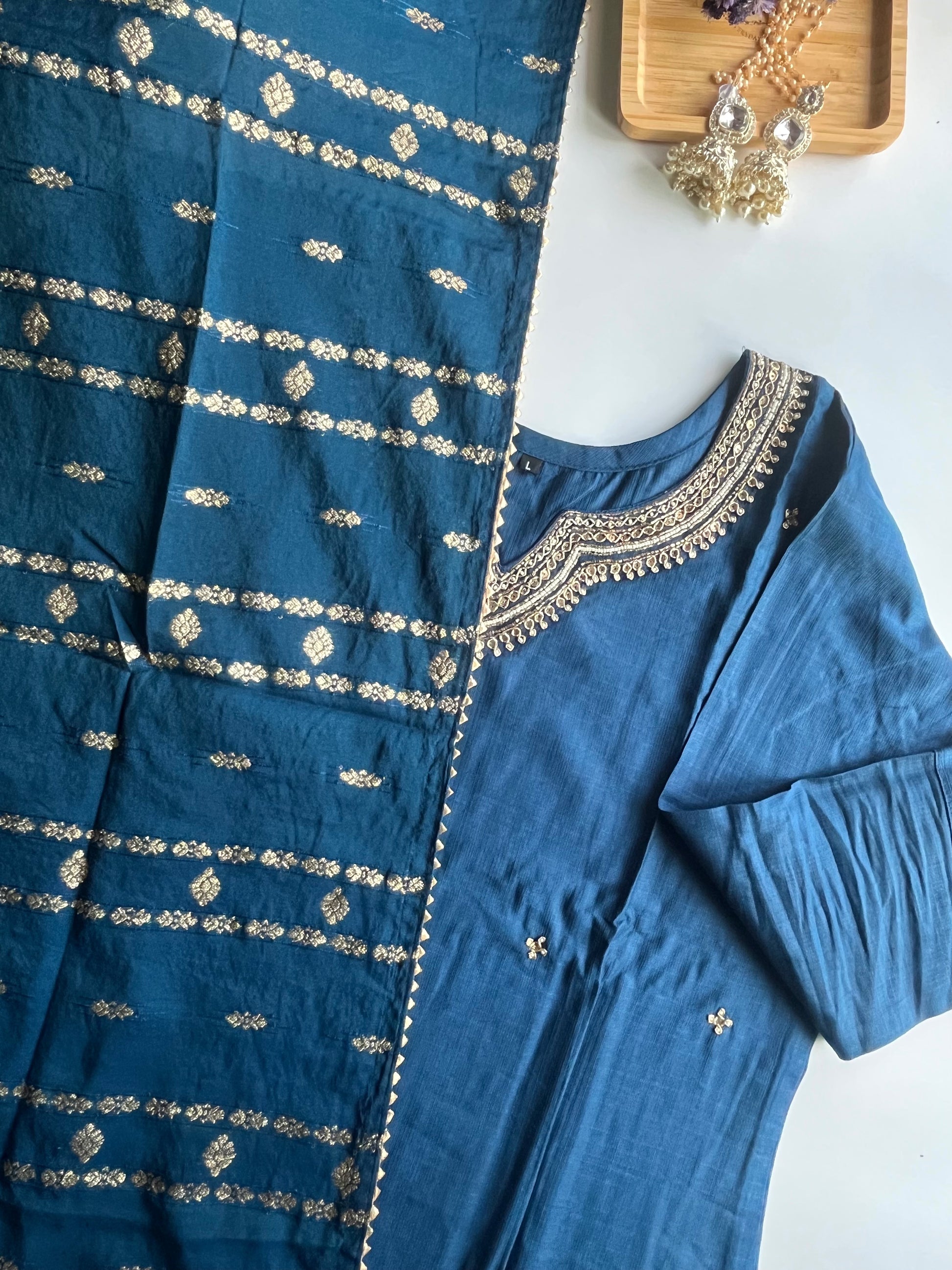 Elevate your ethnic wardrobe with our premium Indira Kurti Set, crafted in luxurious Vatican silk. The elegant indigo blue hue is adorned with intricate handwork on the neckline and delicate motifs on the body, showcasing timeless artistry. Paired with a stunning dupatta and a plain silk bottom, this ensemble is perfect for festive occasions, weddings, or celebrations where you want to stand out.