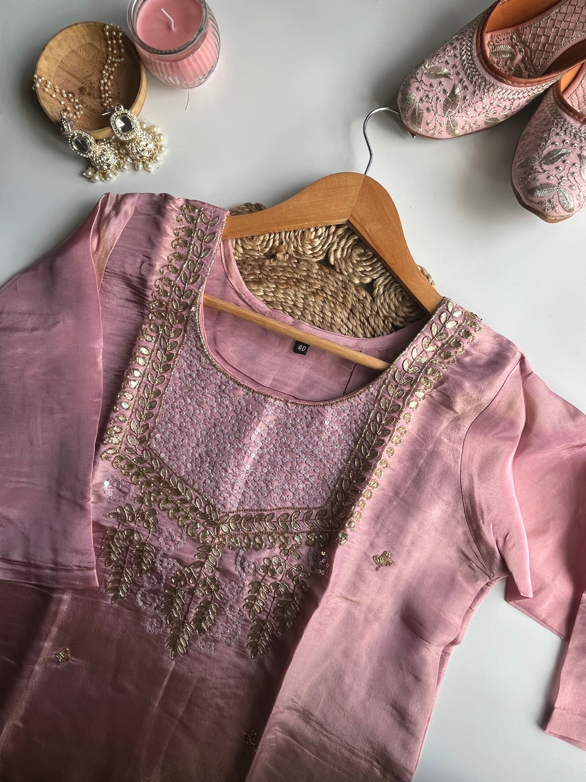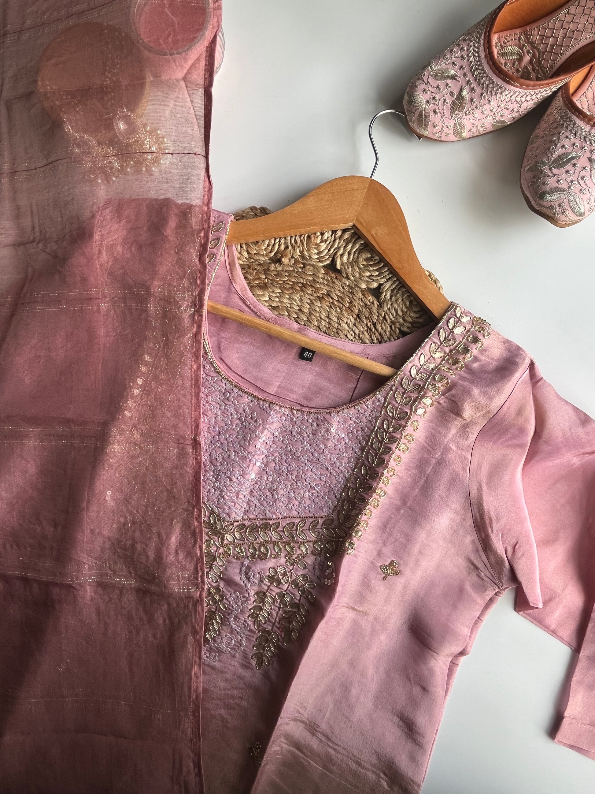 Celebrate grace and tradition with Phoolvati, a charming kurti set crafted in luxurious baby pink tissue silk. This premium ensemble features intricate gota patti handwork on the neckline and delicate motifs on the body, exuding timeless elegance. Paired with a flowing dupatta and a plain silk bottom, this set is perfect for weddings, festive celebrations, and special occasions.