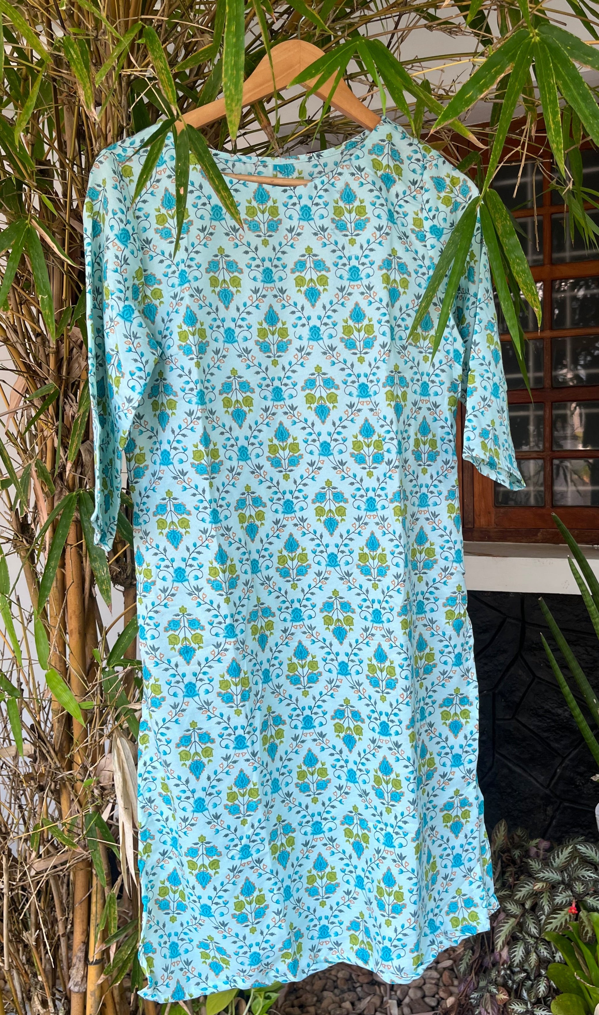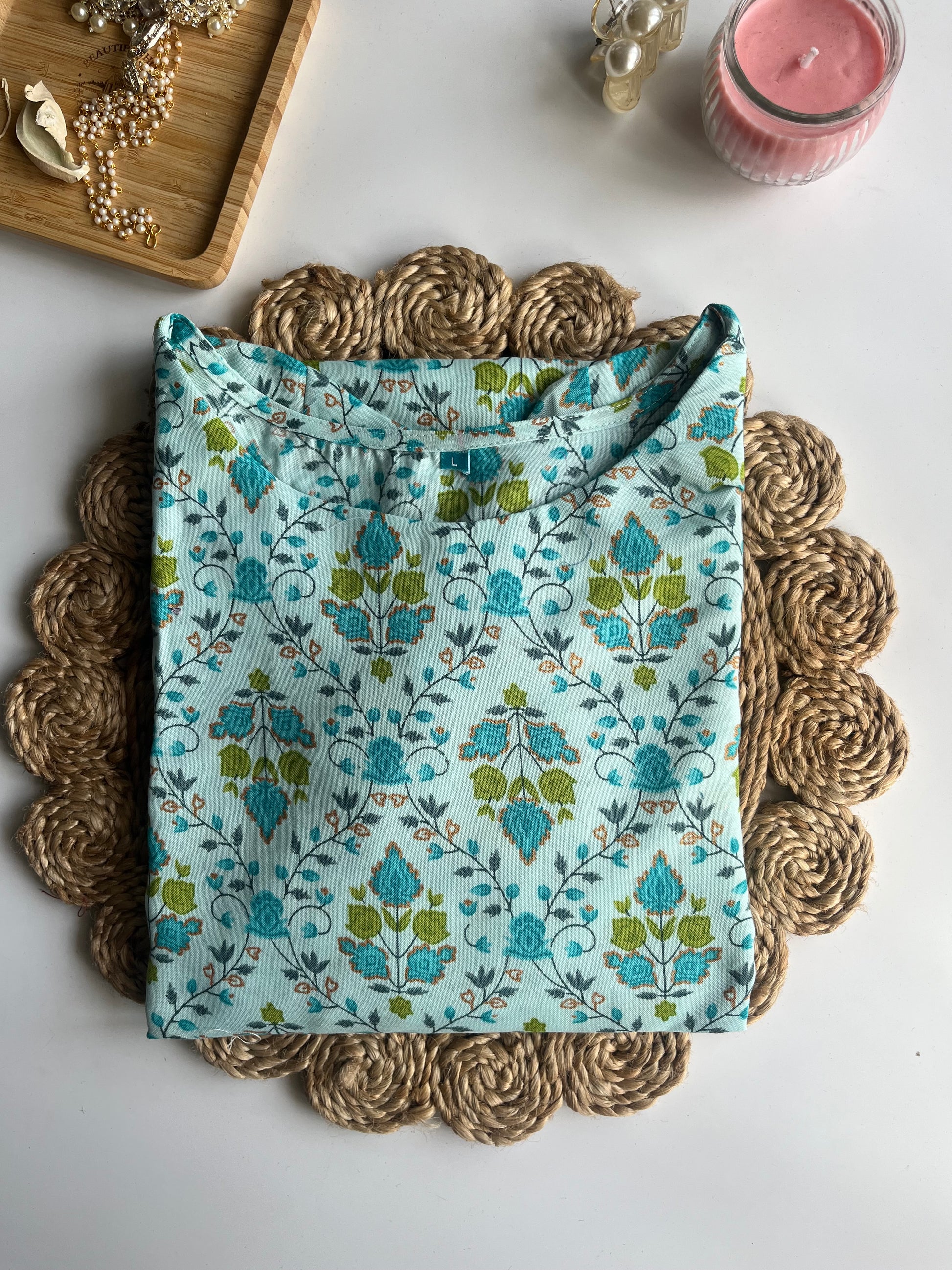 Elevate your style with this beautiful sky blue printed kurta, crafted from soft and breathable rayon fabric. The round neck design adds a touch of elegance, while the intricate print gives it a chic and trendy appeal. Perfect for both casual and festive occasions, this kurta offers comfort and style in equal measure.
