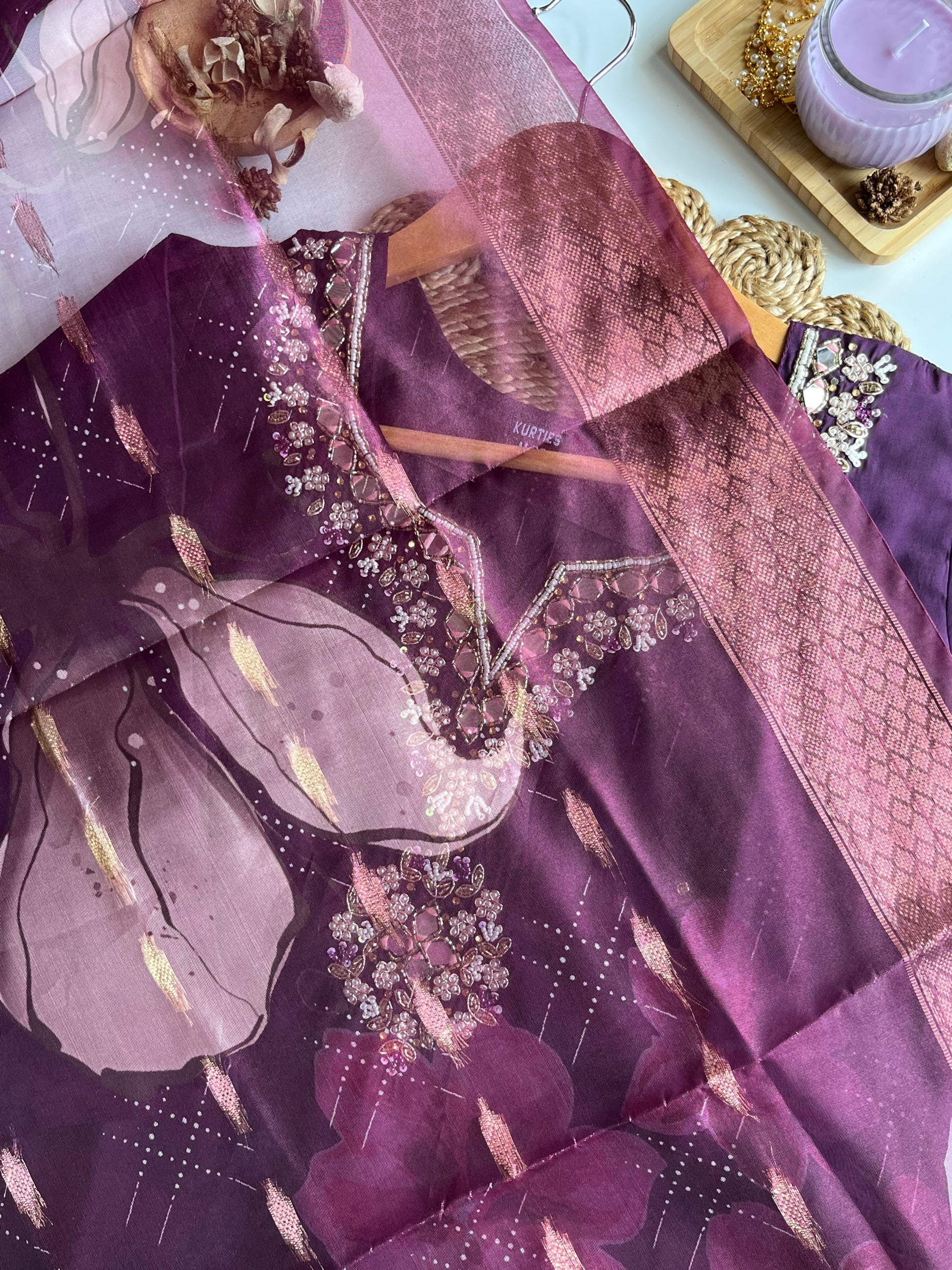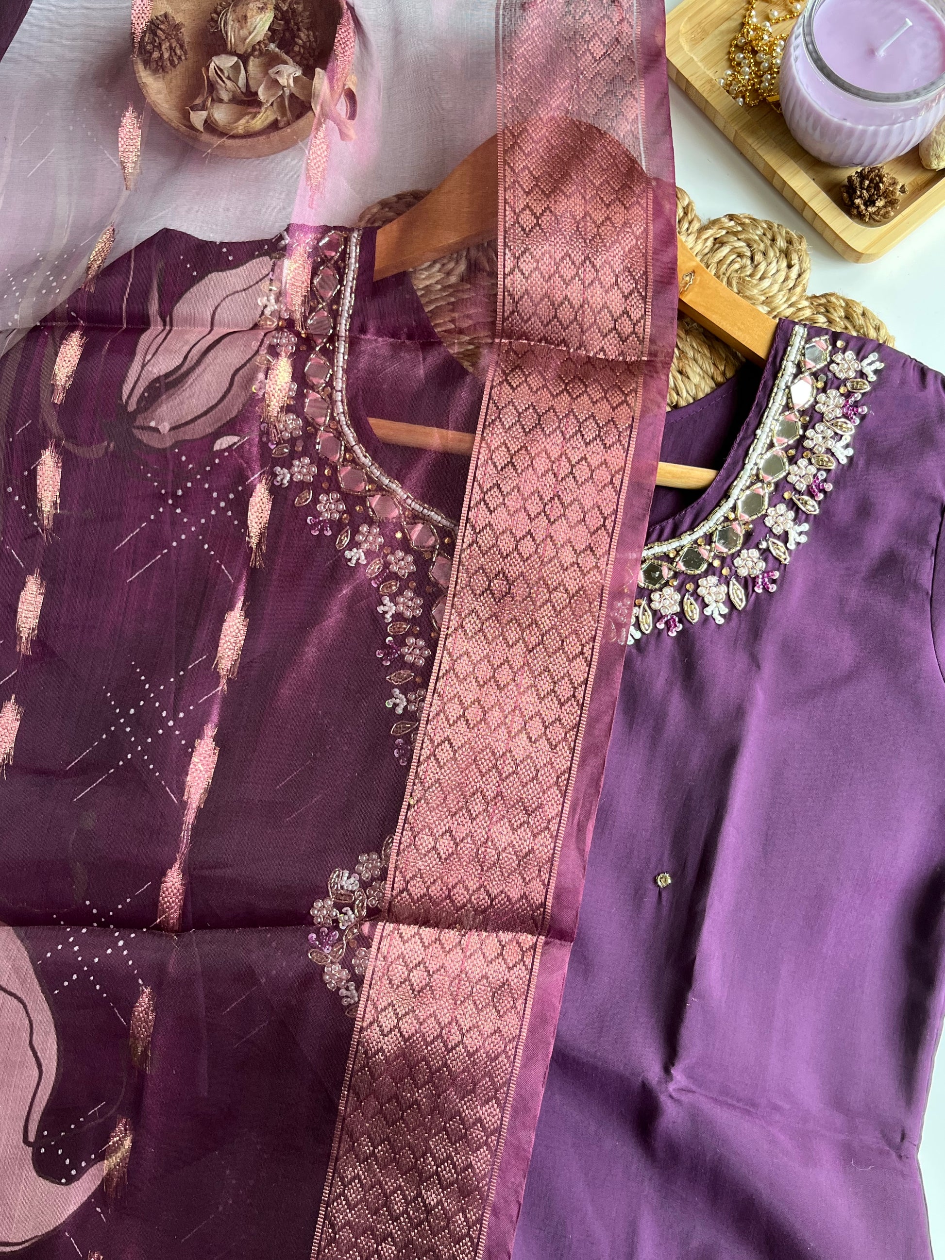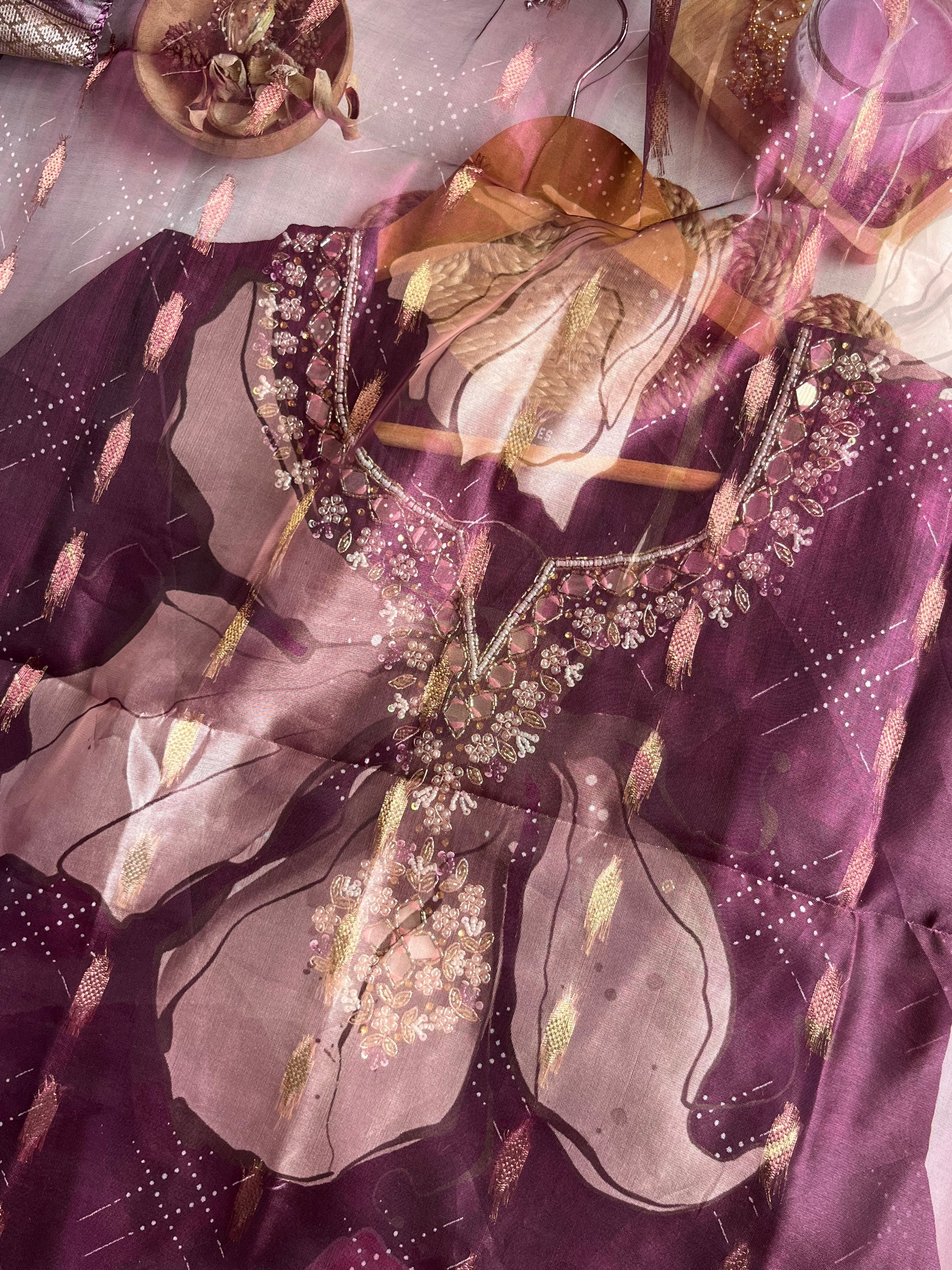 Grace every occasion with the opulent beauty of Tarangini, a luxurious kurti set crafted from premium Roman silk in a royal purple hue. This exquisite ensemble features delicate handwork on the neckline and elegant motifs on the kurta, perfectly paired with a flowing organza dupatta and a plain silk bottom. Ideal for weddings, festive gatherings, and celebratory events, Tarangini radiates timeless elegance.